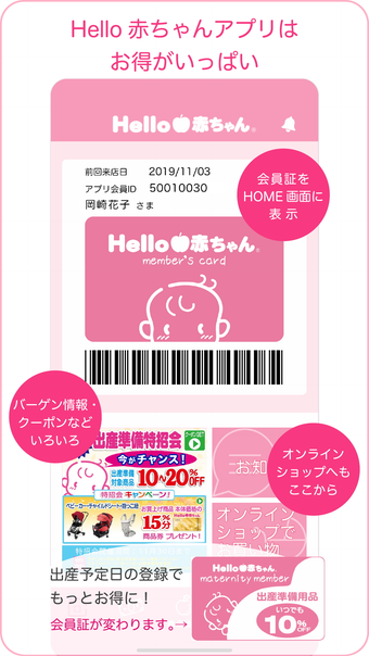 Hello赤ちゃんアプリ คือแอปพลิเคชันอย่างเป็นทางการสำหรับ Hello赤ちゃん ที่ให้บริการในการช้อปปิ้งอย่างสะดวกและคุ้มค่าสำหรับผลิตภัณฑ์เด็ก สินค้าเด็ก และสินค้ามาร์ทาวนี้ ด้วยแอปนี้ผู้ใช้สามารถเข้าถึงข้อมูลที่ช่วยให้พวกเขาตัดสินใจซื้อสินค้าอย่างมีสติปัญญาและใช้ประโยชน์จากสิทธิประโยชน์สมาชิกพิเศษได้
